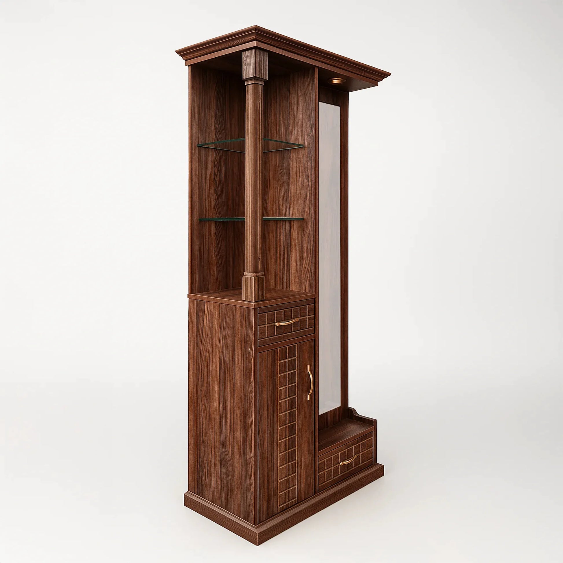Crafted with meticulous attention to detail, its rich walnut finish, classic pillar accent, and intricate carvings exude luxury. The full-length mirror provides a head-to-toe view, perfect for getting ready, while the built-in overhead spotlight illuminates your space for flawless makeup application.