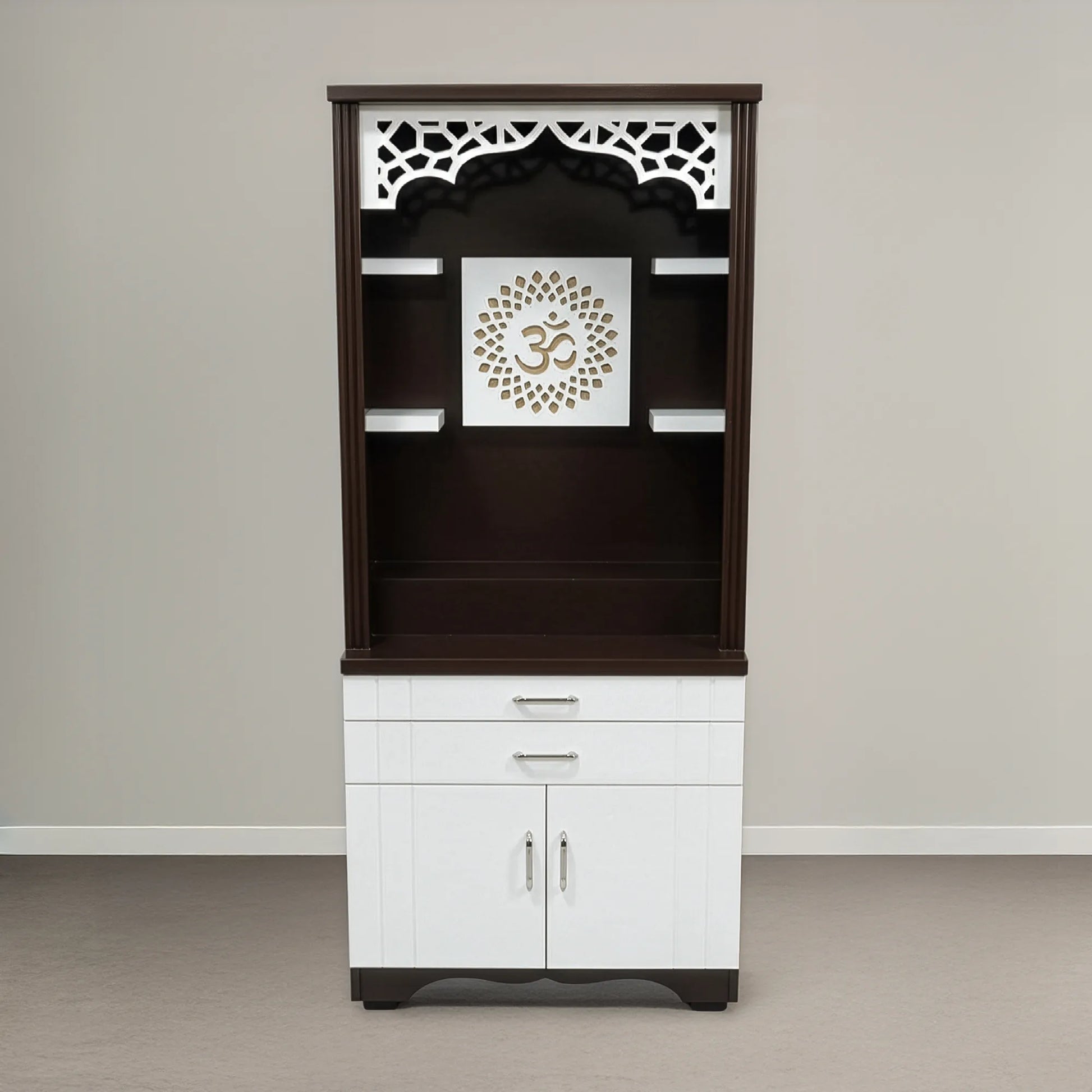 Create a sacred corner at home with this elegant floor-standing home temple. A carved jaali arch frames the altar while the LED backlit Om panel casts a warm devotional glow. Side shelves keep idols and frames organized, and the spacious base with two drawers plus a cabinet stores diyas, incense and pooja essentials. Built from durable MDF Board in a rich brown–white two-tone finish, it blends beautifully with modern interiors. Enjoy free shipping all over Kolkata and a 5-year service warranty.