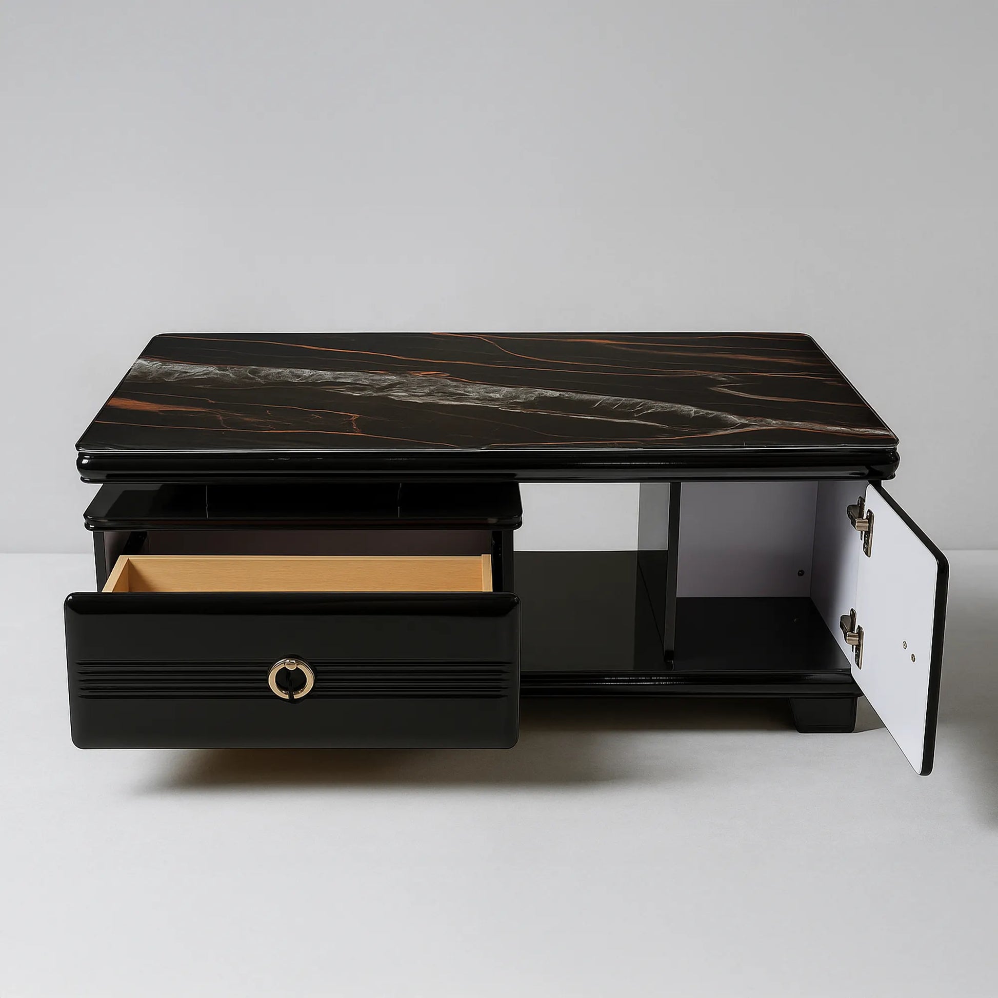 - Finish: High-gloss black body with marble-look top; gold accents on feet/handles