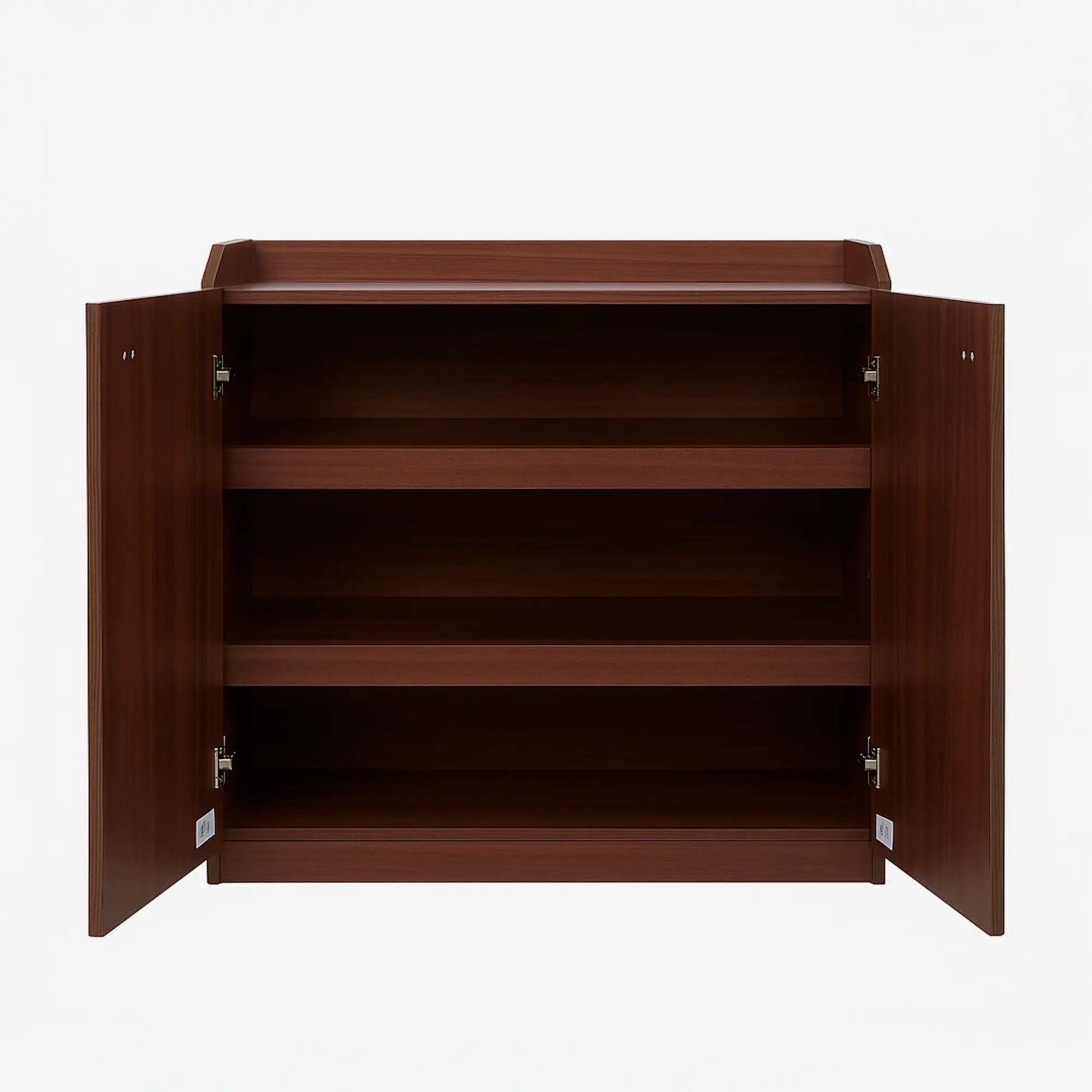 The rich, warm wood finish and sleek, contemporary design blend seamlessly into any decor. Its standout feature is the practical tray-top surface, which has raised edges to prevent keys, mail, or decorative items from sliding off. Inside, three spacious shelves provide four levels of organized storage, neatly concealing your footwear collection behind two clean-lined doors.