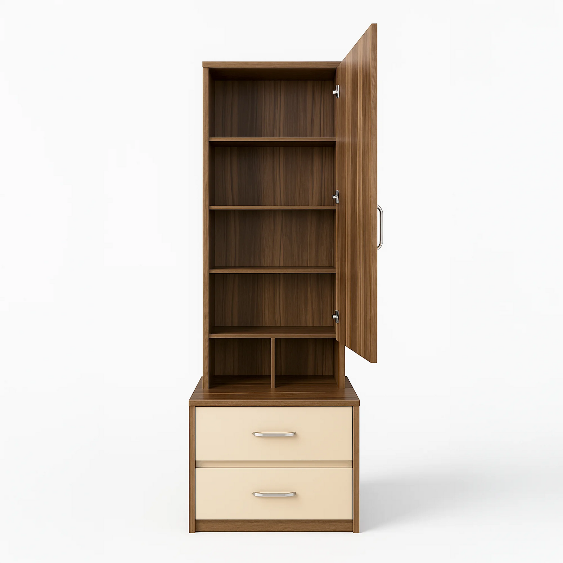 The beautiful two-tone finish, featuring a rich walnut wood grain and a smooth, creamy ivory, creates a sophisticated centerpiece for any room. Its tall, space-saving design makes it an excellent choice for bedrooms of all sizes, providing maximum storage without taking up valuable floor space.