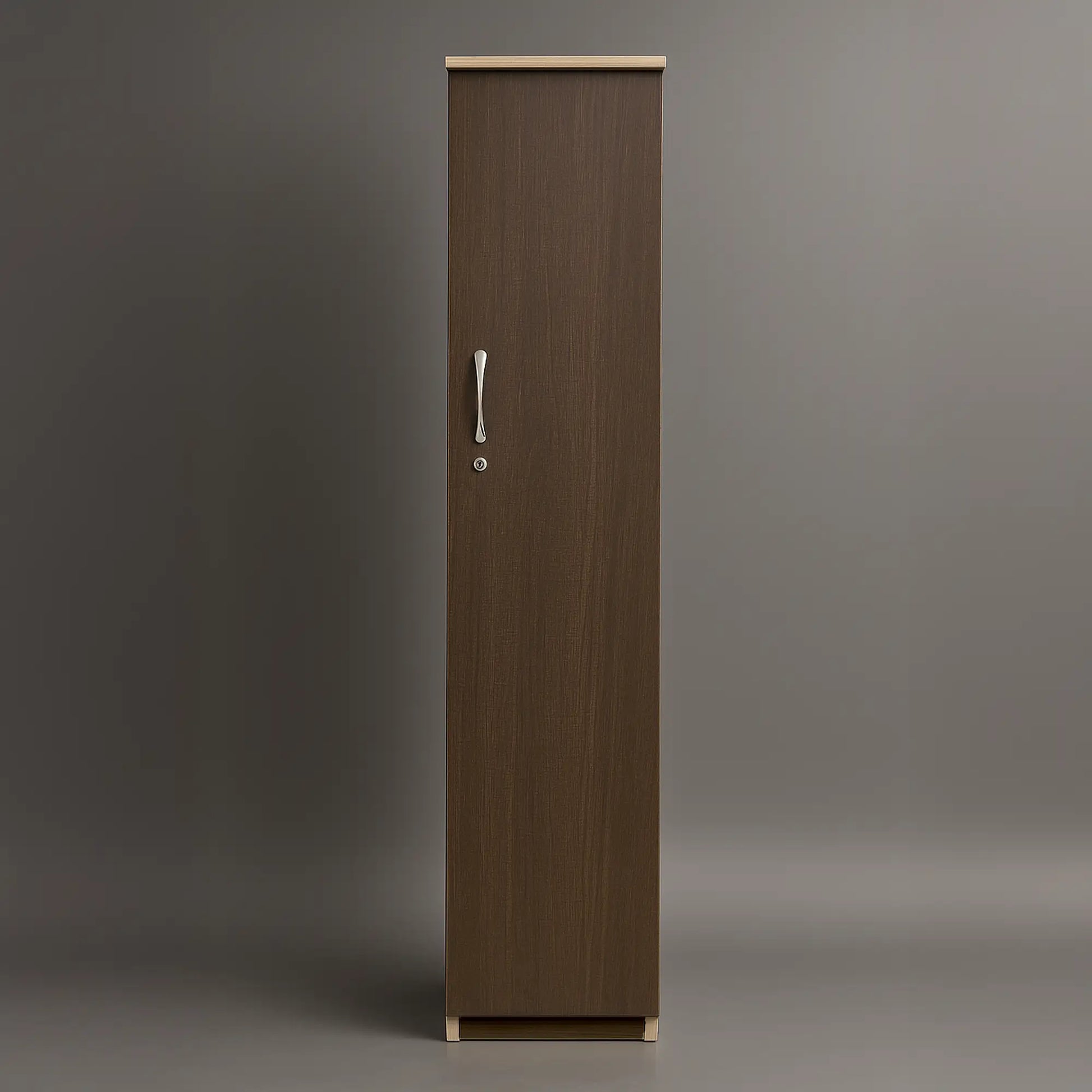 Elevate your home organization with the ModFurn™ Slim Tall Wooden Bookshelf—a stylish, space-saving storage solution crafted for modern interiors. Finished in a rich dark brown woodgrain, this cabinet features sleek silver hardware and subtle beige accents that add a touch of elegance. Perfect for bedrooms, hallways, or entryways, its slim 16" width and 17" depth fit seamlessly into tight spaces while offering generous hanging and shelving capacity inside.